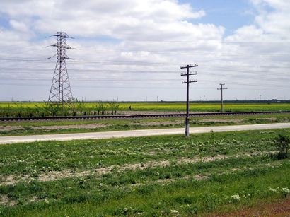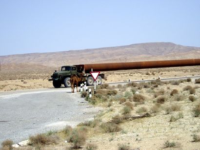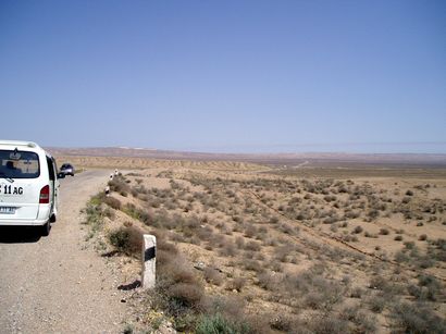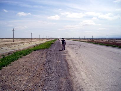 コースの高低差は殆どなく文字通り平坦だったが、かなりの強風が歩行を妨げた。16日は冷たい追い風で快調だった。前日の15日は逆風でおまけに熱風で、アスファルトの照り返しもあり温度は40度を越えていたようであった。 19日は前線通過後の猛烈な向かい風の中を歩いた。20日はコースを逆に歩き、追い風にするよう試みたが、風はずっと穏やかになっていた。晴れた日の太陽は強烈で手の甲まで覆わないと日焼けがひどかった。 そんな中で新井さんが一人照っても降っても半袖で通していた。意外なタフさに感心した。 たまに出てくる都市部を除き、歩行中人に出会うことはなかった。車が90kmを越す猛スピードで、ある時はクラクションを鳴らし、ある時は手を振って走り去って行った。 真っ直ぐ伸びる道の両側はカスピ海に近いほど荒涼としていて砂漠に近く、たまにらくだが放牧されていて、あるかなしかの草を食んでいた。あの大雨の中ではどうしていたのかと思った。 あちこちに青く氷が張ったように見える水溜りがあったが塩である。雨によって低地に塩が集められ蓄積されるようである。この塩をどうするか、灌漑とともにこの国の抱える問題である。これをどう解決したのか聞きそびれたが、アシュガバード近郊では大きな畑が広がり、米や野菜もそこから供給されるようである。その外側は菜の花畑のよう見える農地として開拓されている。 更にその周辺100Kmほどの地帯はかなりの数の羊を連れた牧童をそこかしこで見かけた。彼らが住まいからおんぼろバイクで羊のいるところまで出かけていくのをほほえましく見守った。麦に似た野草が歩いた道の両側にたくさん生えていたからこれは良いエサになるだろうと思った。 |  土漠のなかをどこまでも続く道