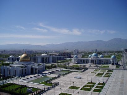 | LATIF社のサメドフ社長、ガイド、運転手アルスランの各氏が迎えてくれた。 サメドフ氏は、全員のビザ期間が14日間であることをチェック。10日以上のビザ発行はここの空港だけのようだ。 トゥルクメニスタン・ホテルへチェック・イン、朝食後、LATIF社と打ち合わせ、費用の総額$5,780(1人当たり$826)を支払う。外国人登録をしてもらう。その後、アシュガバット市内観光。 両替は社長がヤミ市場でやってくれた模様 (1$=20,000マナツト、公式レートはこの1/4のようだ)。 買い物(スーパーで飲料水・アルコール、バザールへ) 歩行のガイド、ディミトリイDmitry氏を紹介される。
