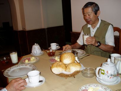 到着早々腹具合が悪くなり慌てた。初日に出された一人当たり大皿一杯のトマト、きゅうりなどの野菜を食べ、ビールを飲んで腹が冷えたためだと思う。これは森さんの経験、見解とほぼ同じ。ビールを控えてお湯を飲み、夜は腹に暖かなフリースを巻いて寝たら、二晩目には回復してほっとした。旅先で腹を壊したのは初めてだが、油断なく体調維持に努めなければと実感した。一緒にに食事をした時、ガイドかららくだのミルクを飲んでみてはと勧められたが、腹を壊しては大変と断った。ほんの少しなめてみたらヨーグルトのような味だった。