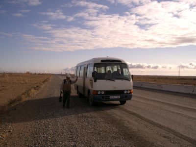 | 3 | 03.11.2 (日) | ジッザク先3Kmまで1・2班がカザフスタン領土を歩行、ジザックへ。このルートでミニバスは、ポリスカーの先導を義務付けられた。カザフ領土歩行について、了解取り付けが難航したが成功。 | 90