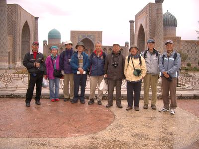 サマルカンド・レギスタン広場にて、左から早川、生和夫人、生和、新井、石塚、平林、佐藤、宇賀村、森
