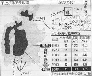 しかし、物の本によると、その陰でアラル海が60年代に66,000Ku以上あった水表面積の4分