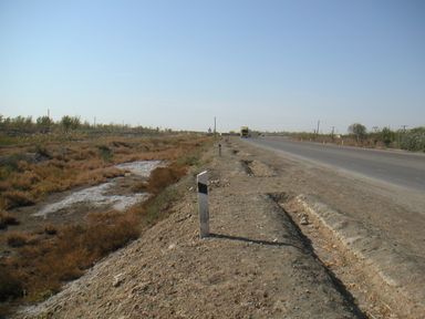 この地域は雨が少ないステップ地帯で、古来より川の水を灌漑して、サマルカンドやブハラはオアシス都市となった。 私共が歩いた国道M34及びM37の沿道は都市部を除き、灌漑が有効に機能し、綿花畑を中心に牧草地、麦畑、玉ねぎ畑、野菜畑、等が連続していました。 1時間も歩くと、大体灌漑水路に出会い、けっこうきれいな流れを見ることができました。こんな平らな国で、豊な水はどこから来るのか、疑問に思いました。道路の両側には防風林として