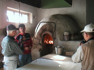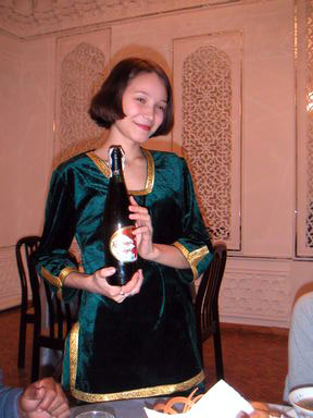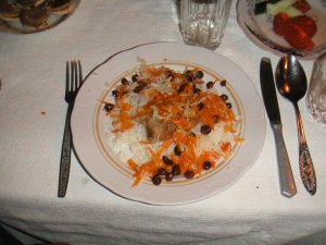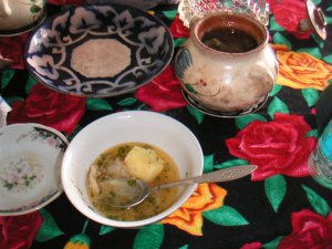 チーズ、種々のジャム、蜂蜜をつけて食べました。 主菜はシシャリク(肉の串焼 き)、ブロウ(焼飯)、ラグマン(肉・野菜入りスープ)、チャナヒ(ツボ入りの