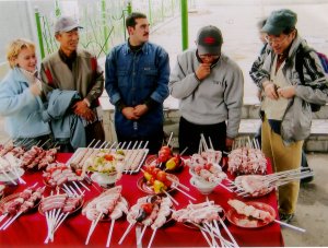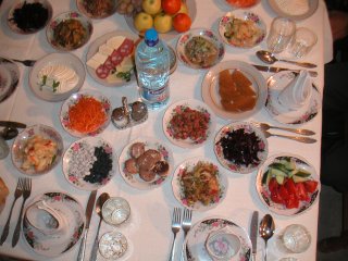 の所を回り、祝の品を貰って戻るそうでした。 食べ物は肉は羊が多いが牛・豚・鳥とありました。魚は少なかったです。野菜 はトマト、キュウリ、ニンジン、ビート、キャベツ、ジャガイモ、豆、等があり、