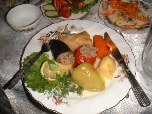 ラグマン)、マントウ(餃子の皮で作った肉まん)、ショルパ(野菜スープ)、 ウグロ(スープにうどん入り)、等を楽しみました。バター、チーズ、ヨーグルト、 チャッカ(チーズと生クリームの中間)も良かったです。