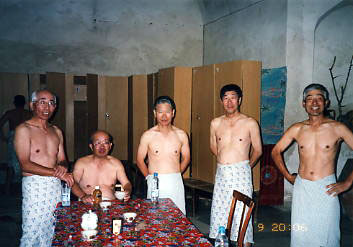 ゴムぞうりを履き、薄い布を2重にし腰に巻き入浴です。脱衣所から続く余熱室に 10分くらい入り、メインの部屋を抜けて狭い入口をかがんで入り加熱室です。砲弾 状の部屋の周囲に1mくらいくり貫かれたところが椅子になり座って温まります。