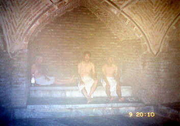 建物は前面石作りでここはその石がじっと触れていられない位熱いのです。全身 から汗が吹き出る頃、呼ばれてメインのへやに放射状にくり貫かれた広い部屋 (メインから見える)の腰掛と同じ高さの床に腰に巻いた布を敷いて横たわります。