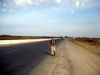 領内を車でなく歩かせてもらいました。その道は1Kmごとに番号を入れた キロポストがあり、それと車のメータで歩行距離を決め、分担して歩きました。 雇った20名乗りのバンで最初のホテルからカザフスタン国境に行き、2名降ろし、