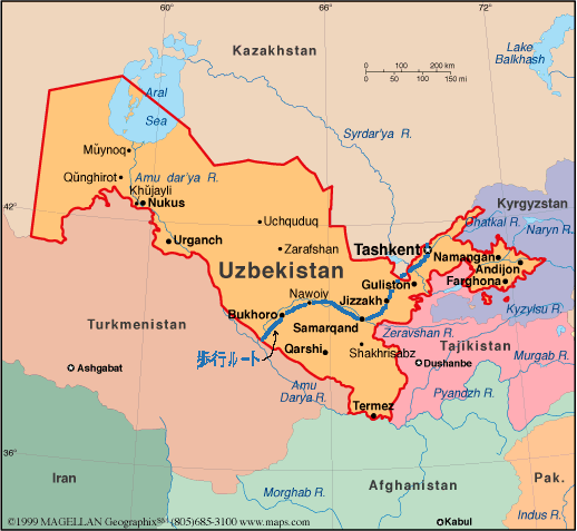 スウズベキスタン、トルクメニスタン、アゼルバイジャン、グルジア、トルコと並び ます。 首都のタシケントへはウズベキスタン航空が成田ー関空ータシケントー