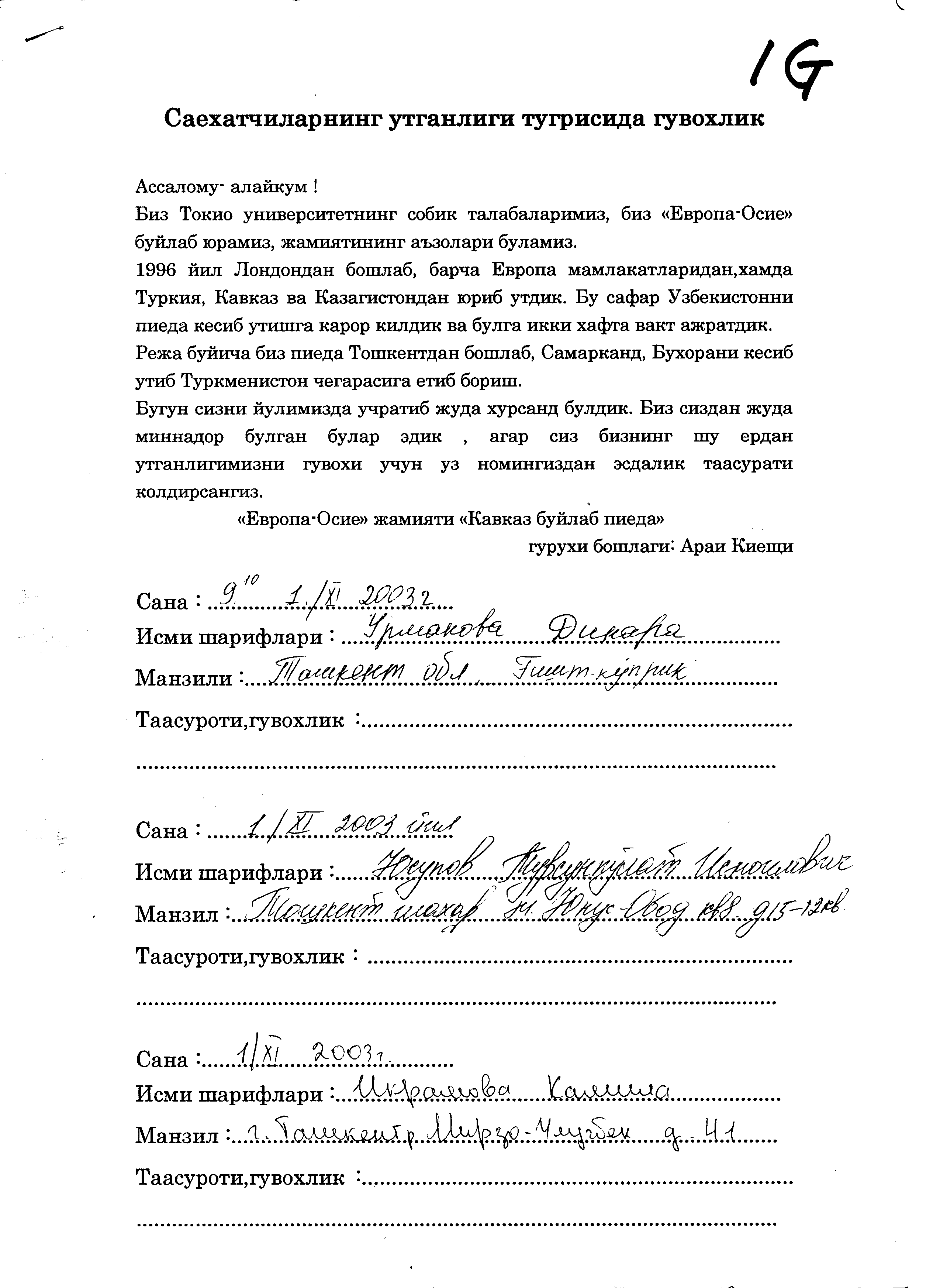 今回の通過証明は、エルビーラさんにお願いしウズベキ語で作ってもらいました。 ここには、「我々がロンドンから東京まで歩いてそのトレースをつなげようとしていること、今回はウズベキスタンのタシケント側から、ブハラのさきのトルクメニスタン国境までを歩こうとしていること、今日あなたとであったという証拠にサインをほしい」といったことが書かれています。