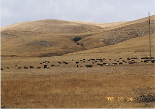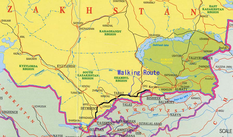 | <概要> 昨年ニューヨークで起きた衝撃的な事件後の安全を考えて、急遽歩行活動を本年3月迄一旦停止と決めた。 折角10月実施の決まっていたトルクメニスタン西部も実行凍結、安全確認後と総会で決した。その後の情勢判断から、6月のトルコ歩行が実行された。 同時に中央アジアの歩行ルートの検討をし 、トルクメニスタン・ウズベキスタン・カザフスタン経由で中国国境を目指すのが、比較的安全なルートと判断された。 中央アジアへの第一歩は、現地情報の収集ルートのあるカザフスタンからとした。ウズベキ国境〜中国国境までおよそ1,200km、これを西部・東部に分割。 今回のカザフスタン西部歩行隊の計画及び結果に就いては別項目の通りです。 計画立案に不可欠の現地情報は、石塚(5期)人脈による豊田通商山田氏からの絶大な支援により入手出来ました。 予定ルート試走写真・キルギスタンとの越境回避・ホテルの有無,グレード、コスト・支援車両と通訳の手配など・・・有難う御座いました。 また国内では探し様の無い50万分の一地図が、都立大OB フジクラ佐々木氏からメールで送られてきた事も大変な安心感を得られたものでした。(175万分の1のみ市販。) 大過無く完歩し無事帰国でき あらためてお二人に感謝申し上げます。 ![]() <写真 左から石塚、跡部、新井、荒井、早川、平林、森 アルマティの博物館前にて> <感想その1・早川> Steppeを歩く・・・初体験は予想と大分違うものだった。広大さは予想以上の体験。 全行程に亘り毎日100km程南方にキルギス国境の4,000m級の天山山脈の支脈を遠望し、 北側には乾燥した褐色の大草原が広がり、そこで牛・馬・羊を追うカウボーイは声を掛ければ気軽に応えてくれる。 舗装された国道を時速100kmでさっき私を追い越したトラックが 遥か遠く逃げ水の上に蜃気楼の様に黒い四角の点として見えている。時計を見れば10分は過ぎている………15km先の車影がわかる。 私との間にはなにもない。 所々に旧ソ連の寸断された高架式コンクリート製農業灌漑用水路小麦・綿花等の廃工場があり村人の生活と全く関係無く存在している不思議な、過去の負の遺産も目に付く。 帰り新参者・・・・・早川(4期)は96年イギリス・97年ドイツ以来 6年ぶりの参加であり同行のメンバーは毎年参加のつわもの達。 足手まといになる不安を覚える。6月〜9月にカナダに遊びに行き名ばかりの隊長。 計画段階は全て荒井(8期)まかせで実現できたのは彼の手腕によるものです。有難う。 <感想・その2 平林> 今年の6月のトルコの旅に引き続き、カザフスタンの旅に参加した。トルコもカザフスタンも、国としての特別な思い入れもなく、長い会社生活から訣別した解放感から、昔の仲間と一緒に旅をしたくなったからだ。 昨年の10月、軽い脳梗塞を患ったが、幸いにも軽い後遺症しか残さなかった。医者から旅の心得として、 @朝晩の薬(バッファリン系の薬で血管を拡げる)を飲むこと。 Aこまめに水分を補給すること。 Bアルコールは、ビール500cc以上は飲まないこと。 C睡眠は良く取り、疲れを残さないこと。 に注意すれば心配なしとの事であった。限りある人生、たのしめる時にたのしもうと云った楽天的な気持ちで、病気の事は心配しなかったのが本当のところであった。 今回は、ナビゲーターとして伴走車に乗って気楽な旅をしようと積極的に参加した。結果は、期待した通で、カザフの大草原を車に乗り、気ままに歩くなどしてたのしい旅であった。 ユーラシア歩く会の計画で残されている中央アジアや中国の旅は、伴走車がつくので年齢的な心配や体力などで自信のない人も気安く参加するようにおすすめしたい。 <感想・ナビゲータ 平林> ナビゲータは車と通訳が付くから気楽にたのしんでくれとの事での参加だった。しかし運転手と通訳は日本語が全くわからず、寝る時も同じ部屋で過ごす日もあり、日本語でのんびり過ごせると云う思惑は、はずれてしまった。 又、メンバーの健脚振りは、1日昼食事時間を含め25km、5時間で、1日2時間ほどのんびり過ごすと云う思惑もはずれてしまった。 このため、ナビゲータとしては、食料や水の補給や道路の情報をサービスする仕事を真面目にやらざるを得ないはめになってしまった。 しかし、車に乗って歩行者のサービスを真面目にやると、歩行3班で1日75km、その前後を2往復すると1日に400〜500kmの走行になり、ガタガタの道で車の中でゆられると、これも連日になると大変疲れる。 従って、勝手ながら毎日歩く時間を取らしてもらった。最終班のメンバーと一部を同行して歩くか、最終班の走行予定の最終部分を5kmほど1人で逆行して、走行時間を1時間程短縮するとか、体の不調な人と交代したりして、毎日車に乗ったり、歩いたりして自分なりに歩く事を楽しんだ。 車に乗って、接した風景や人の生活などは、歩いている時に感じたものに比べると上っ面をなでるだけの大変軽い感じで終わってしまう。歩く事は全く単純な行動だが、歩く事で