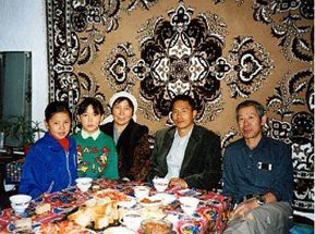 男がなんか言っている。跡部さんが「旅のときはお互い様、ついてこいと言っているよ。」 どうなるか分からないが、2人で男の後をついて行く。 2軒目の民家で、若いお母さんが顔を出し、ニコニコ手招きしてくれた。 言われるままに靴を脱ぐと、部屋に通された。一段上がったフロアは、客間風。 お母さんは座卓を運んできて、お茶の用意などしてくれる様子。小学校5・6年と思われる娘もでてきて、お茶や砂糖など運んでくる。 そのうち野菜サラダや自家製のパンがでてきた。お母さんは、頭に巻いていたスカーフを換えて来た。 私はもっぱらボディランゲージと絵を描いてコミニケーション。跡部さんは男と盛んに話し、解説してくれる。 「ソ連時代は仕事があったが、独立以来仕事がなくなり困っているてさ」 このお母さんはニコニコ、よく笑う。これまで歩行途中に出会った女性たちは、「ズラーストビチェ」にほとんど応じてくれない。 シャイなのか、亭主以外の男とは話していけないといった習慣なのか、下を向いているか、目でチラッと見るだけが多かった。 そのうち娘の友達もきて、珍しい人種を観察している様子。 娘たちには、東京や京都の観光案内書を、お母さんには和風の小物入れをプレゼントする。 そこを辞そうとすると、お母さんは納屋のほうからりんごをいっぱい持ってきてくれた。それに自家製のパンも。 「スパシーボ」を連発し、最大限の感謝の気持ちを伝える。私たちは身も心も温かくなり、歩く元気が沸いてきた。 お母さんが、「あなたたちお金はあるの?」と心配してくれたとのこと。我々が何で歩く旅をしているかまでは、とうとう理解できなかったみたいでした。 くだんの男とここのお母さんの関係は、跡部さんも分からず仕舞い。兄弟?、親戚?。 | ||||||||||||||||||||||||||||||||||||||||||||||||||||||||||||||||||||||||||||
