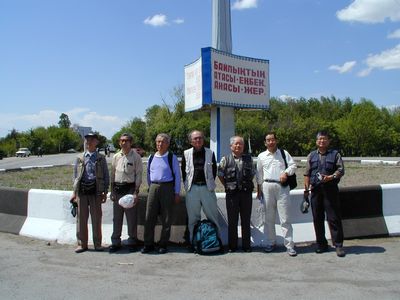 | 4 | 03.5.19 (月) | ホテル発/8:15−歩行開始/8:45、3班で歩行。10:00amころ、豊田通商・山田氏が車で到着、歩行中の和田隊長に日本からの緊急連絡を伝えた。(和田隊長の母親入院のため緊急帰国要請)山田さんに帰国のための便確保をお願い。 3班が州境の検問所で止められ、歩行の趣旨説明に時間をとられた。アルマティの手前33kmまで。 | 75