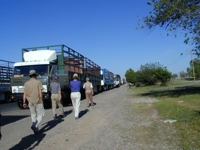<中国国境> SARSのために中国国境は閉鎖とのことだったが、物資の輸入は継続している様子だ。 国境から4kmまでの検問所まで行けたが、それから先は中国へ入国する以外には通行が許されない。国境を背にした写真撮影は禁止されているので、通関地区への順番待ちの大型トラックの行列横を通りながらシャッターを切った(添付写真)