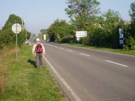 またまた運よくハルマンリ行きのバスが出る所で、今日の1班の川田、篠崎は今日の出発点のハルマンリに戻る。今朝来た同じバスの折り返しだった。2班の斉藤篤、中村は再びホテルの前を通って、二班と落ち合う中間点のリュービメックに向う。昨日と違うのは沿道に高い木立が立ち並んでいること。昨年のチェコと同じ歴史のある道なのだろう。終始、左側にオリエント急行の走る鉄道線路が併走する道を進む。畑の景色は昨日とほほ同じ。特に変化は見られない。篤さんはわき目も振らずピッチを上げる。中村はビデオを撮っては小走りに後を追う。1、2日目とも2班に分けて歩いたが、正解だったと思う。今回2日で歩いた道を4日掛けて歩いたら、その単調さに飽きたかもしれない。
