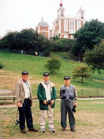 <1期 藤田 一郎> 綾部さんが苦労して確保してくれたアエロフロート便は当日の21時ヒースロー着、 先発の早川夫人に迎えられてシエラトンホテルヘ。翌朝、全員顔色、食欲もよく安心する。 早川夫人手配のレンタカーで出発地グリニッジヘ。意外に手間取り11時着。 旧天文台で緯度ゼロをデザインしたキャップを買って記念撮影。2万キロ第1歩は ここから始まるの感で身がひきしまりました。 さて第1日は時差ポケなどと言ってはおられず、されど体調も考えて20キロ程度は歩きたいところ、 12時には出発したいので内心あせる。折角なのでテムズ河畔の高速お茶運擬船カティサーク(短い下着)号 と世界初世界1周ヨット(ジプシーモス号)を早川夫人がてきばきと作ってくれたサンドイッチをかじりながら見ました。 和田さんは手回しのオルガンのおじさんから離れたくなかったようでしたが、出発。曇時折小雨のもと、 森と住宅がかわるがわる出てくるA20道路をまっすぐ、大都市環状線と交わるダートフォードで大ロンドン圏 を抜け出すべく黙々と歩きました。この間早川夫人はどこからともなく現れて激励の役。途中5人でパブに とぴこみましたが、若者向きのモダン・パブで場違いの感じ、交流にはいたらずでした。 5時間歩いて夕暮れとなり、3人の万歩計を見ると約15%の差、人情として一番歩数の多い早川さんのものを採用、 20キロを完歩、B&B探しにかかりました。しかし、ダートフォード周辺には5人がまとまって泊まれるものがなく、 早川夫人が深してくれてあったホテルに入りました。 第2日も曇、気温は昨日より少し上の13度前後、歩きやすい。今日はロチェスター迄と元気に歩きだすが、 道を間違えて戻り、A20へ。道の左側の地形が大きな凹地となり地図にチョークビットとある。 地肌がチョークのように真っ白で、破片で道路に書いてみると、まるで黒板の上のような具合。 この辺からドーバーのホワイトクリフ(白い崖)迄地表下20センチはチョーク層なんですね。 そこで、地表をめくって、丘の斜面に縦百メートル程の大きな白い十字架や、リンドン大学の紋章のクラウンなど が措いてあるのにその後出会いましたが、緑の中に白く浮き出てとてもきれいでした。 A20はその後A2へ交通量の多いこれも幹線級の道路に合流しますが、これはロンドンとヨーロッパを結ぶ 片側3車線の高速道路、この側道をトラックにあおられながら歩く。周辺は森や畑で時々脇道が現れて救われます。 今考えてみるともっと気分のよい道が他にあったのでしょうが、なにせ先の見通しがつく迄はという気があったので 最短距離を歩いたのでしょう。昼食はA2沿いのある村のパブに入りましたが、ここはトラディショナルで、 客も村の衆、雰囲気上々でした。わっせわっせと歩いていくと、ドーバー迄60キロとの表示、やったぜもうこっちのものだ とA2に別れ、ロチェスターの街へと車の少ない並木道を心安らかに下ってゆきました。 道は旧市荷に入っていきますが、人をほっとさせる雰囲気です。 ここから後は地図にあるNORTH・DOWN・WAY(ノースダウン丘陵のトレール・道幅0.5〜1m)で 森、牧草地・牧場・丘陵・村落を辿ることに衆議一決、足りない地図の買える隣町の本屋を案内所のかわいいお姉さんに 教えてもらった挙げ句、「欲しい地図があるか聞いてみてくれませんか?」などとかなりの時間会話を楽しんでおりました。 そんなこんなで大体止した後、紹介されたB&B的小さな宿へ足を引きずりながら小1時間長い坂道を丘の上の街へ登ってゆくと、 先回りした早川夫人が現れ、「もうふさがっていて泊まれません」。結局元へ戻り大聖堂脇の19世紀建造、 ライトアップされたお寺が美しく見える小さなホテルに落ちつきました。電話で早く申し込まなかったのが失敗のもとでしたが、 明日の分まで稼いだと思えば気が楽になりました。その夜もパブに出かけました。 第3日は快晴、今日からケント州のカントリーサイドを満喫できるぞとの想い。早川さんは日本を出る前に「俺は3日以上もつかなあ」と言っていたので、「今日は奥さんと地図を買いにいって、そのあと合流したら?」と聞くと、「いやあこうなったら全部歩きたいですよ。地図はワイフ一人で買えますよ」との返事。今日前半は手持ちの地図で大丈夫なのでいさんで出発。天気がよいのは人の心も晴れやかにする。ブルーべリーヒルを過ぎた所で、黒くて甘い桑の実の形をしたものをむさぼっていたら、通りがかりのおばさんが「それはブラックベリーよ」と教えてくれた。 丘陵への取り付きでちょいと回り道をしてしまうが以後は順調。雑木のトンネルを快調 に歩く。今日は携帯電話を我々が持ち、早川夫人が電話をかけてくることにしたが、公衆電話が少なく連絡がままならない。が、うまくオートキャンプ場で落ち合い、木かげの楽しい昼食、そして地図も手に入りました。このあたりのノースダウンウェイは道標も少なく、途中で車道へつながったりするので判