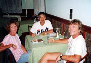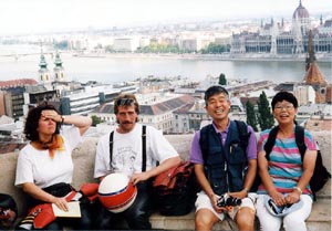 コマロムでホテルを確保しほっとする。ホテルで若い娘に通過証明を貰い写真を一緒にとったが、小柄と思っていたら私より背が高くびっくり。歩いて旅をしている人なんて初めてだから写真を送れと頼まれる。 ドナウの川岸に出てみるとでかい船が係留されており、対岸はスロバキア領である。遠くの橋の中程にゲートが見える。 日課の洗濯を終え夕食。川マスのフライと山ほどのじゃがいも・サクランボの冷たいスープ・ビールで約700円。行動時間7.5h、30千歩/23キロ。 8月18日(月) コマロム→タタ→タタバンヤ 幹線道路を離れ、タタを目指す。町外れで大きな桃を3個/約100円、いちいち重さを計るのがなつかしい。久しぶりの曇り空で風が涼しくほっとする。車が少ないので、道ばたの花じっくりを見ながら歩く。あざみ、えんどう、松虫草もどき、キリン草もどき・・・・・ と花は多い。 15キロを4時間ほどで歩きタタに到着。自慢の足もまめと疲れで、棒になりかかり、みっともない歩き方になっている。フォリントの手持ちが無く銀行も見つからず困っていると、郵便局でチェンジしてくれることが分かった。頼むと1万円札を台帳の写真と照合、初めてのようなので、すかしがチェックポイントだと教える。 タタは古い遺跡も残っており、散策したいところだが足がいうことを聞かず、ひたすら先を目指す。幹線道路脇を汗まみれで、傘を差しはちまきをして歩く。最後はホテルのバスルームでゆっくり汗を流し、ビールを飲みたいなと、それを支えにやっとタタバンヤ駅前のホテル着。 8月19日(火)タタバンヤ→ブダペスト インターシティでブダペストに戻り、市内でルーマニアの地図を探し歩く。地図の専門店も含め3軒ほど回るが、1/25万が一番詳しかった。 日本大使館の秋山さんの自宅にお願いしていた荷物を引き取り、インタコンチネンタルホテルにくつろぐ。ホテルの部屋からはドナウの流れと対岸の王宮、鎖橋が眺められまさに絶景、しかも大使館値段でかなり安い。秋山さんに感謝!! (秋山さんはハンガリー語教室で一緒、今年の春にブダペストに赴任、副領事です) 感想 ハンガリーの広さと人の温かさに触れることが出来た旅でした。しかし、真夏に歩くのはかなりの消耗で、お奨めできません。途中歩いて旅をする人は全くいませんでした。一人旅でも全く心配入りませんが、交通事故は心配です。それとブダペストの地下鉄のスリは要注意です。女房と観光していたときに狙われました。 地図は事前に詳しいものを入手するべきでしょう。今回は知り合いのハンガリー人とコンタクトして現地で貰うこととしていましたが、行き違いで会えず困りました。また、宿の情報もあるといいでしょう。 それと富士山の絵はがきをかなり持っていき出会った人にサインし渡しましたが、相手にも直ぐ日本というのが伝わり喜んでくれました。民宿はクレジットカードが使えず、手持ちの現金が底をつき、キャッシングの暗証番号も忘れたためすってんてんで成田に到着、これがまた厳しかった。 |