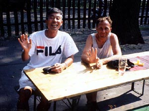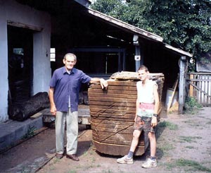 アクスの入口で、自転車に乗った爺さんに「ヨー!ナッポット」と声をかける。すると爺さんがが引き返してきて、以下彼との会話。「この暑い中どこまで行くのか?」「今日はコマロムまでさ」「コマロムまでは10キロもある、駅まで送ってやるからこの自転車の後ろに乗れ」「歩いていくことにしているんだよ」「なぜ歩いて行くんだ?」・・・・・ それ以上は言葉が続かず、ハンガリー語教室の岩崎先生に添削して貰った、通過証明の紙を彼に見せる。しばらくそれを見ていた彼が、えらく感動した様子で顔を上げ家によって冷たいビールを飲んでいけという。まだ先もあるのが気になるが、これも旅だろうと思いついていく。爺さんがぞろぞろ歩いてくる教会帰りの知り合いに 「この日本人はモションからタタバンヤまで歩いているんだよ」というもんで、みんなが手を振ってくれる。 爺さんは大工のマイスターで74才、第1次世界大戦に従軍したという。仕事場のテーブルにナプキンを広げグラスを置き、更に孫を呼んで冷えたビールを持ってこさせる。私も辞書を引きながら何とか単語を並べ謝意を表する。言葉は正確には分からないが、彼の歓迎の気持ちは十分理解できた。通過証明にサインをして貰い、私も日本から持ってきた富士山の絵はがきにサインし渡す。