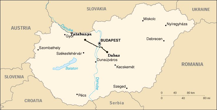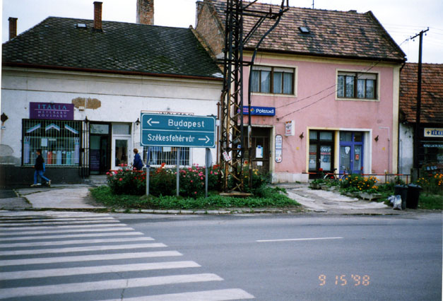 9月18日(金)晴れ時々曇り、時々雷雨 今日は最後の行程天気も良く列車でダバッシュに向かう。 ダバッシュを通る列車は支線のため本数が少なく、またその列車がなかなかわからず、9時過ぎの列車をやっとつか まえてダバッシュに着いたのは10時を過ぎていた。 ダバッシュはわりと大きな街で駅から街の郊外に出るまで5km位もあった。 次の街フジェイまでは途中大きな墓場があった 他は一面トウモロコシ、らい麦の収穫後の畑が広がっていた。また途中ものすごい雷雨に あい、木の下に避難したもののビショヌレになってしった。幸いその後晴れたのでプジェ イに着く頃はすっかり乾いていた。 タクソニイまでは真っ直ぐの道、所々に小さな集落が あったが、はとんど人影は見られなかった。タクソニイに着いたのは夕方7時まえであった。 ブダペストに列車で帰り着いたのは午後8時前、インフォーメイションもしまってい て、ホテルを探すのに苦労、トイレは共同、シャワーなしの安ホテルに泊まる。 <右写真;今回の終着点、DABAS駅> |