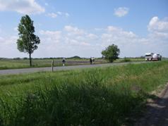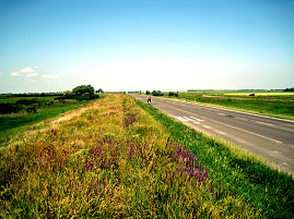 やがて国道の両側は、果てしない緑の麦畑になった。ところどころに見える木立の連なりは、国道に繋がる横道だった。まだ穂の出ていない畑から、すでに色づき始めた畑まで、多少の濃淡はあるものの、壮大な眺めである。しかも、ほとんど平らなのだ。北海道の畑もこの大平原の麦畑に比べたら、ちまちましてしまう。農産物の国内需給率を議論するなら、この風景を見たうえですべきであろう。