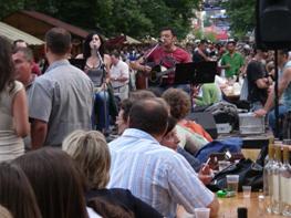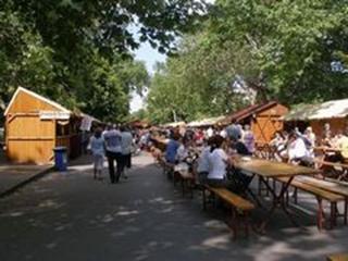 セゲド(リングの内は静かで風格ある都市で淡水魚のスープが名物)で歩行2日目を終え、3時ころから“ワイン祭”を見物しに町に出てみる。周辺は農地でたまねぎとパプリカの有名な産地。ホコ天の道路とテイサ川(ハンガリー第2の川)に架けられた橋には屋台が約1Kmの長さで、丁度世田谷のボロ市を小綺麗にした感じ、青葉に陽光がまぶしい。露天市に続く並木道の両側に国内各地の自慢のワインを並べたプレハブの店が100件くらい競うように客待ちしている。まだ人出は少ない。1軒目の若い男の主人に試飲をできるかと聞く。OKだ。そこで赤、白の辛口を頼む。2件目から若い女性のいる店に行く。試飲できるかと言うと有料だと言われる。残念だ。財布と相談しながら篠崎と飲む。トカイも、バラトンもあるが高いのはやめて1杯200フオリントFt(1Ftは0.7円)程度のものにする。
