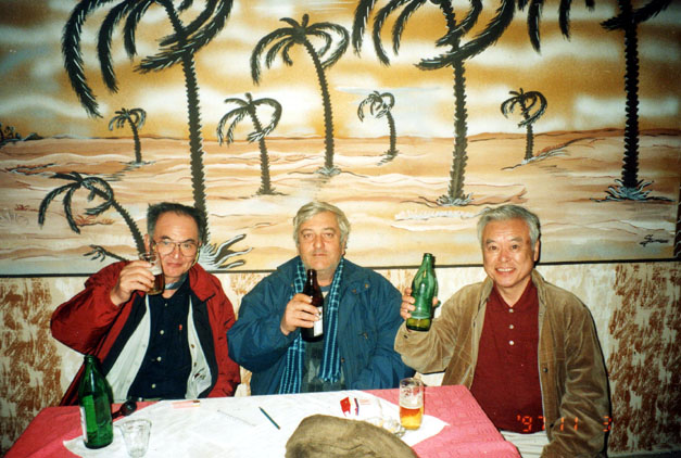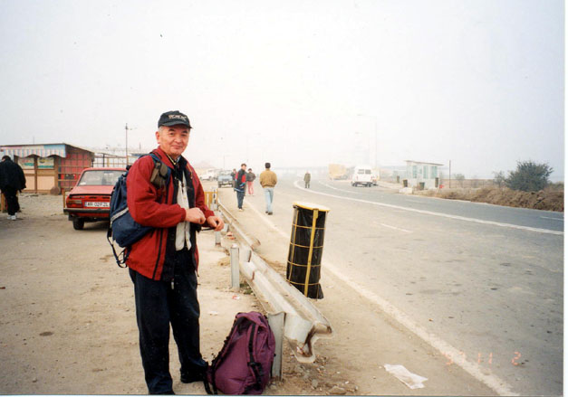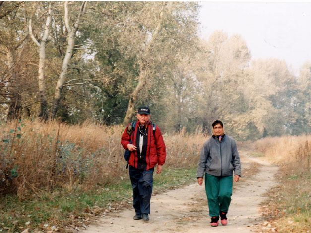 セルビア人などの住むこのあたりでは、各々の宗派の教会が必要なのだろう。道の両側 の広い草地には鶏、七面鳥、あひるが遊ぶ。 村と村をつなぐ街道は、両側に地平線までトウモロコシ畑が続く。今日の歩きの終点 ペリアム村で出会ったエルミチおじさん、奢るからと村のバアに誘われ、郷土料理の豚 の粗挽のつくね、ミティティとビールをご馳走になり、駅まで見送られる。写真を送る 事を約束する。 ローカル列車は4両の客車をデーゼル機関車がひく。すっかり暗くなっ たが客車の蛍光灯は全部外されていて真っ暗のまま。ティミシヨアラ駅前でタクシーの 運転手にホテルを尋ねていると、髭面の青年が英語で話しかけてきて、タクシーで二つ 星のホテル、バナトゥルまで案内してくれた。彼はグルジアへ登山で行ったが、しょっ ちゅう検問だったそうだ。それはいいことだ。私達はここをベースに3泊するつもり。 | ![]() <ペリアム村のエルミチおじさんと和田、藤田> |