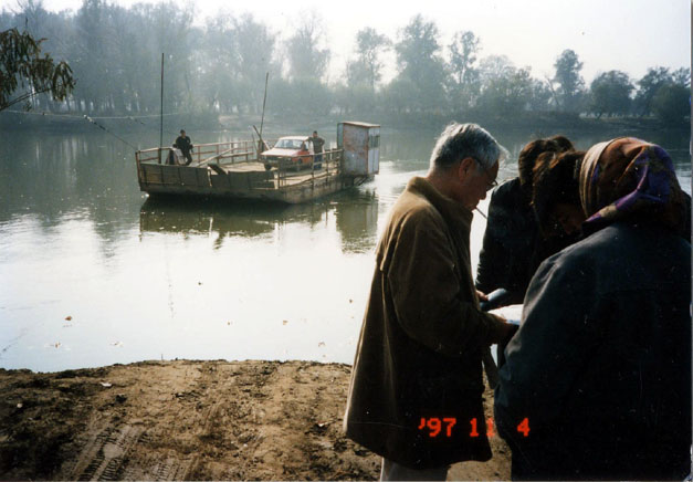 ![]() <ムレッシュ河は、幅が広く流れも早い。藤田(1期)> | ![]() <渡河点がやっと見つかる。はしけがやってきた> |