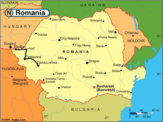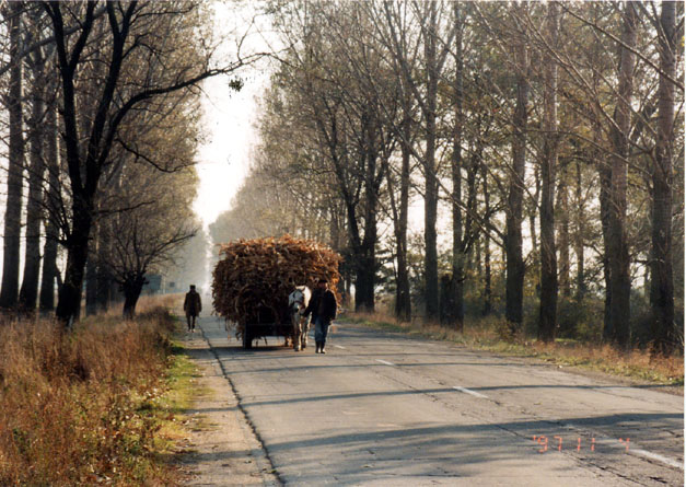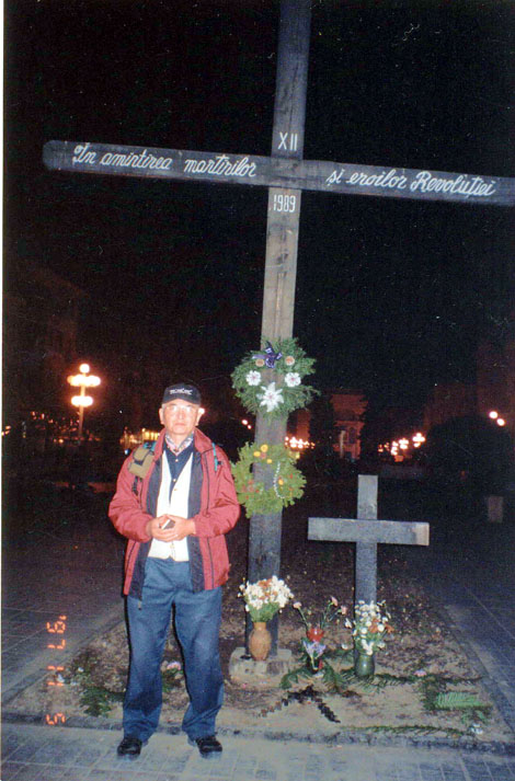 | 11月5日(水)晴れ寒い朝、0度C、川面が凍る。 ティミショアラからプジアスまでは二人で街道をゆく。道端には単にはねられたハリ ネズミの死骸が転がっている。路傍の小さな十字架は交通事故にあった人のもの。 道をたずねたガソリンスタンドのオーナにコートをご馳走になり、食事のできるレ ストランの場所をおそわる。村の道端に点々とある手漕ぎの井戸でつめたい水を飲む。 ブジアスの町のプチレストランでめちゃくちゃかわいい娘のおすすめのステーキ、ビー ルで乾杯する。 ティミショアラに戻って夜の市内を二人で散歩する。 1989年12月、反チャウチ ェスク革命の口火となった広場にあるルーマニア正教会の階段では、教会に逃げ込む子 供たちの背後から治安部隊の銃弾が浴びせられ、多くの血が流されたという。それを弔 う大小二つの木の十字架が建っている。広場の両側の商店街はにぎやかで、昨夜は向か い側にあるオペラ劇場でオペラが上演され、盛装した観客が集まったとのこと。 | ![]() |