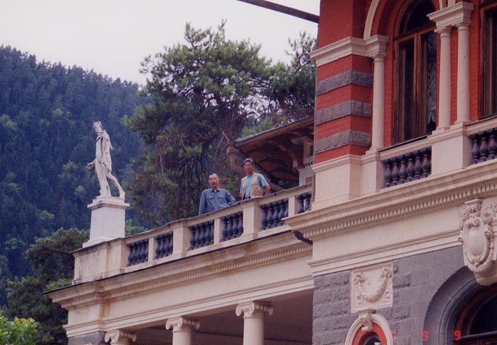 ![]() 18:30 Bordzomi到着。高い鉄の柵で囲まれており、ガードマンがその都度門を開けて入れてくれる。 昔はサナトリウムと言って貴族の保養地で広大な敷地に中に建物が点在している。路で会う人達は手にボトルを持ちゆっくりと歩いている。 有名な鉱泉を汲みに行くらしい。後で飲んでみると生暖かくあまり美味しくない。宿舎は1892〜1895年に作られた2階建ての 立派な建物でパレスと案内の女性は言っている。流暢な英語で色々説明してくれる。 スターリンも泊ったとか言っていたが外見は立派だが内装は派手な色使いで決して上品とは言えない。1人1泊食事付きで$64程。 オレッグ氏達3人は別棟だった。我々の建物の近くにシュワルナゼ大統領の別荘が有り銃を持ったガードマンが寄せ付けない。 明日は休養日なので2晩ここに泊ると思うと何となくのんびりとする。 食事は大食堂でとるがアルコール類は一切無い。 夕食はパン、ハンバーグ、オムレツ、それにおじや風ご飯は果物入りの味がして糊みたいで非常にまずい。 飲み物は紅茶。料理はあまり美味しくなかったので翌日の昼は外でとる事にした。 夜は石塚氏がわざわざ外出して買ってきたビールとワイン、スイカで楽しむ。 <写真;元ロシア皇帝の別荘、スターリンも利用したという。我々も2泊した> |