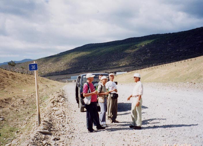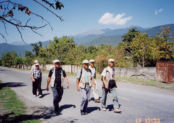 ![]() 9:50 出発。今日は最終日なので全員で歩く事になり、車はトヨタハイエース1台に全員が乗り込む。 11:00 第1班、133kpから和田、荒井、オレッグで12km。 11:15 第2班145kpから。初めて土屋さんと歩く。土屋さんも速い。初めの内は正面にコーカサス山脈の南の端の山々が見える。 一部頂が白く光っているのが見えるが、雪でなく岩が光っているようだ。 1時間程でT字路。両脇の民家はLagodehi村か。角の店で色んな木の実を売っていた。ちょっと顔を突っ込む。 民家の造りは殆ど同じだが中には立派なお屋敷もある。貧富の差が拡大しているようだ。 T字路より道は右折し南下する。途中土屋さん子供達に囲まれる。 13:25 川を越えた所で終了。当初、各班12km歩く予定であったが残りの距離が短い事が分かり、2班は10kmで終わり、 3班は5kmと短縮された。車を待つ間に小学生らしき男の子と英語でしゃべる。学校がトビリシまでとかなりの遠距離通学で驚く。 ここから車で国境のそばまで移動する。 |