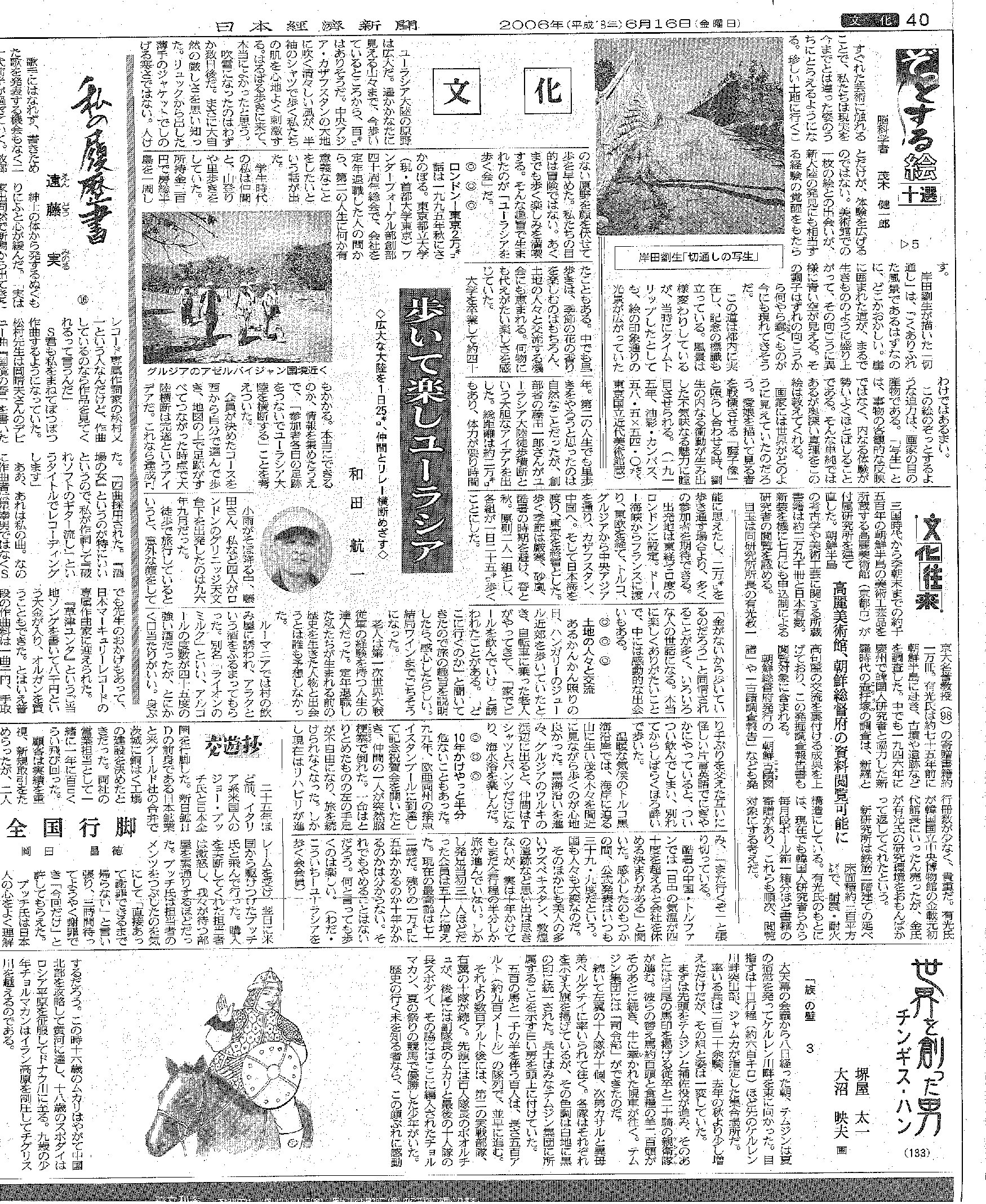 「歩いて楽しいユーラシア」と題して、会員の和田航一さんの話が掲載されました。会の誕生秘話、歩行の苦労話、土地の人々との交流の話など、「10年かけて半分、残り何年かかるか分からないが、それでもやめられないだろう。なんといっても歩くのが楽しい」と紹介されています。